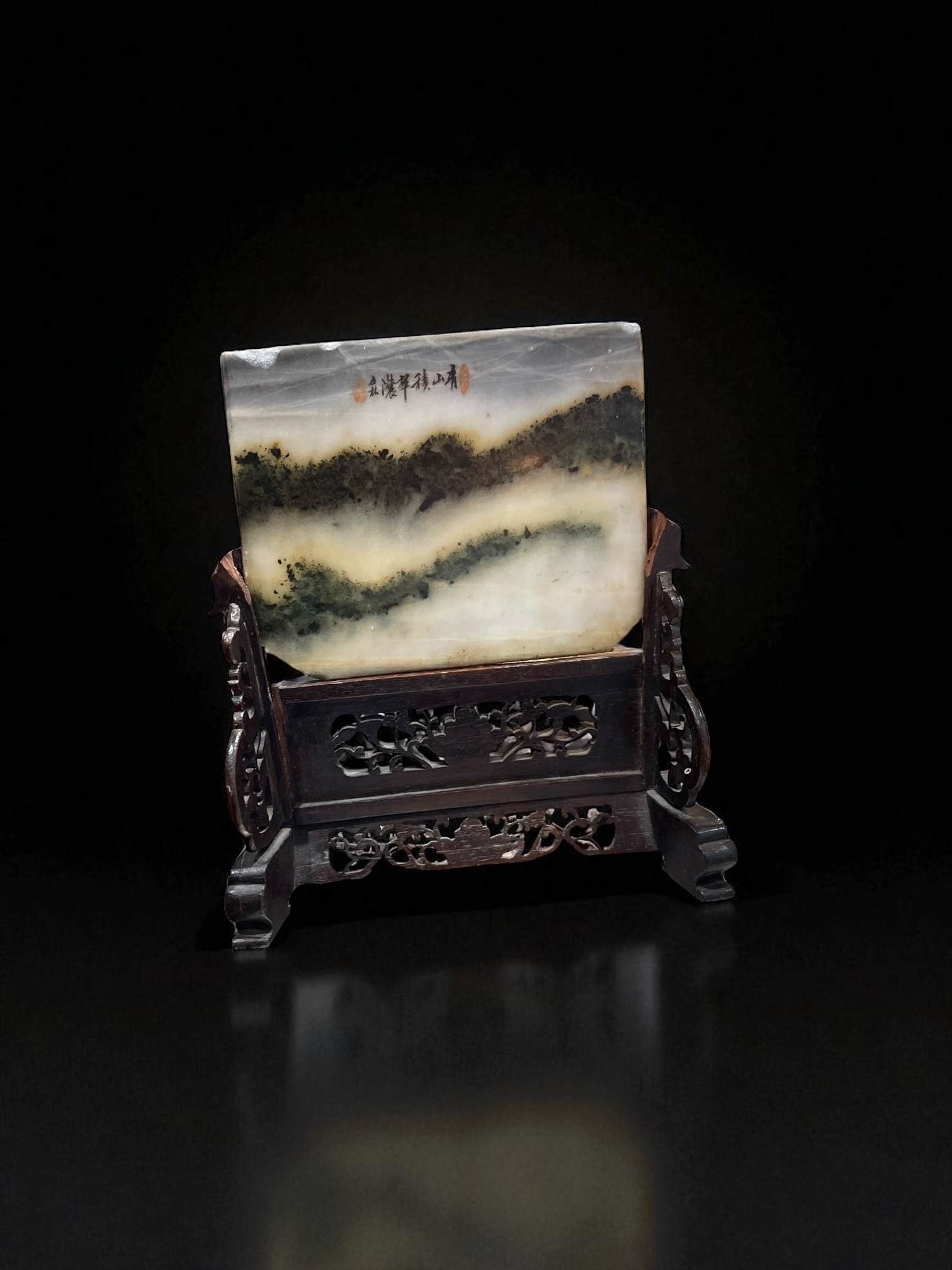 Pierre de rêve montée sur un socle en bois exotique, Chine, XIX eme