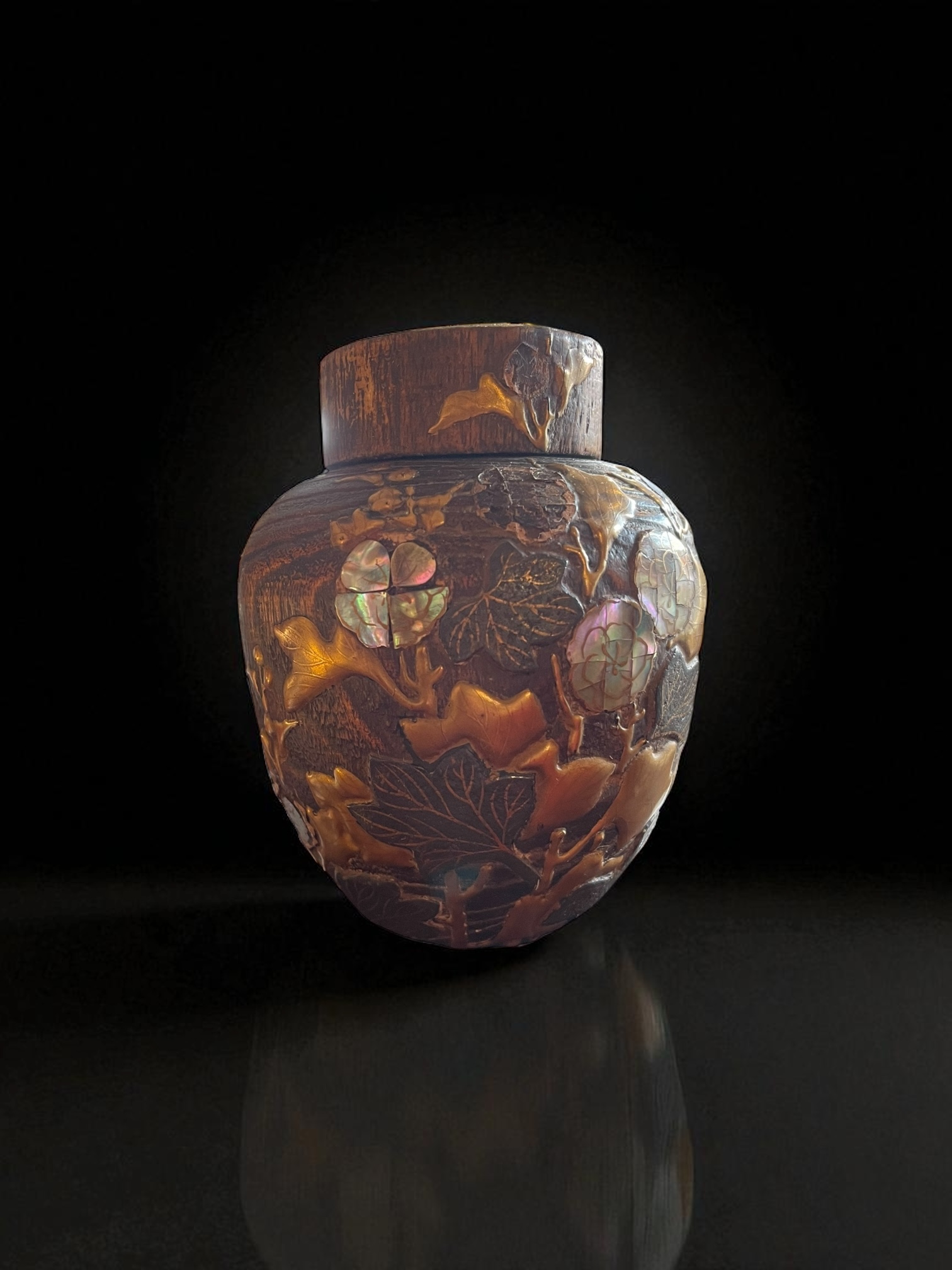 Pot couvert en bois, laque et nacre, Japon, XIX eme