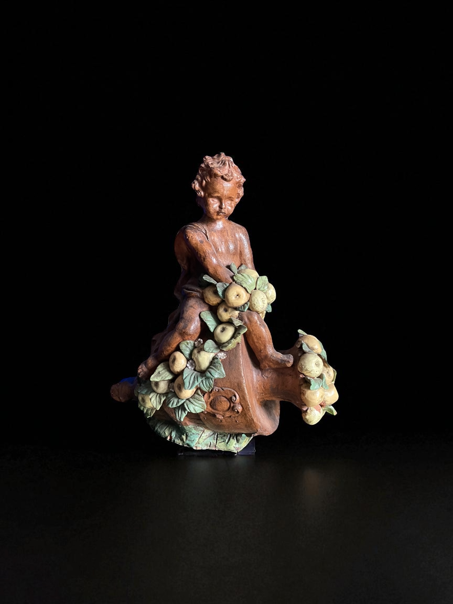 Putto sur un vase entouré de pommes, Terre cuite polychrome et émaillée Italie début XX eme